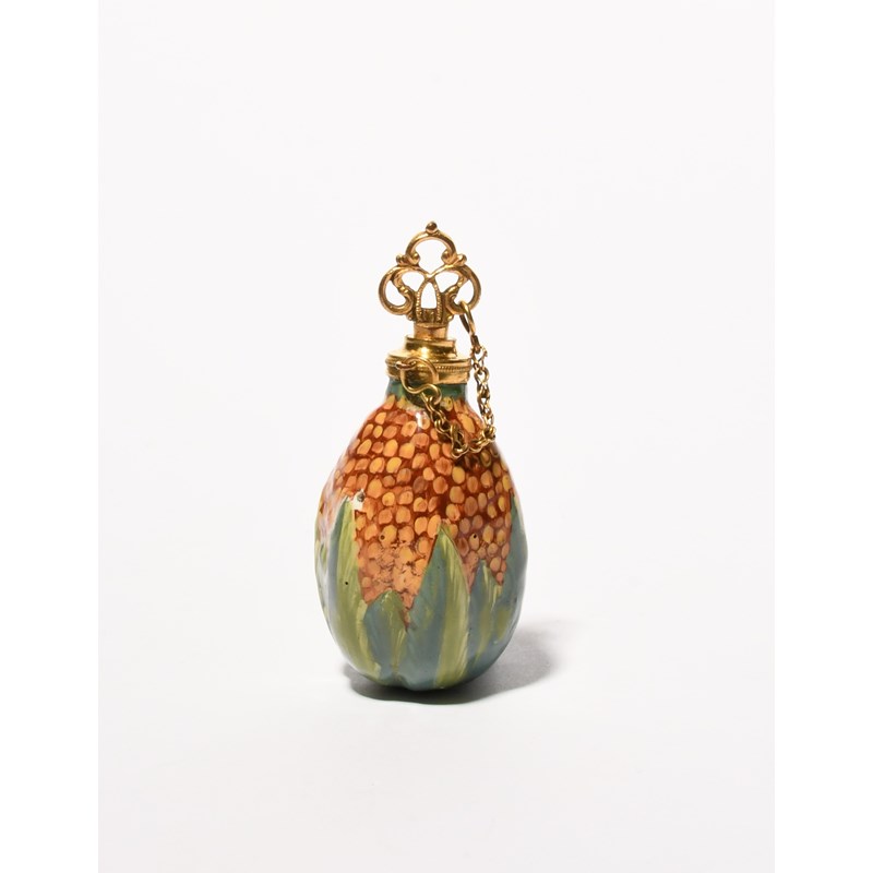 A rare English enamel scent bottle, c.1780-90, formed as a pineapple issuing from basal leaves, with a gilt-metal scrolled stopper, 7cm.