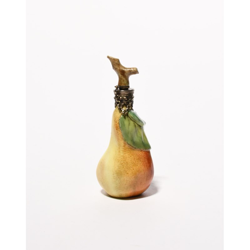 A Furstenberg scent bottle, late 18th century, modelled as a large pear with russet patches and two large leaves, with silver mounts to the neck and the stopper formed as a twig, 9cm.
