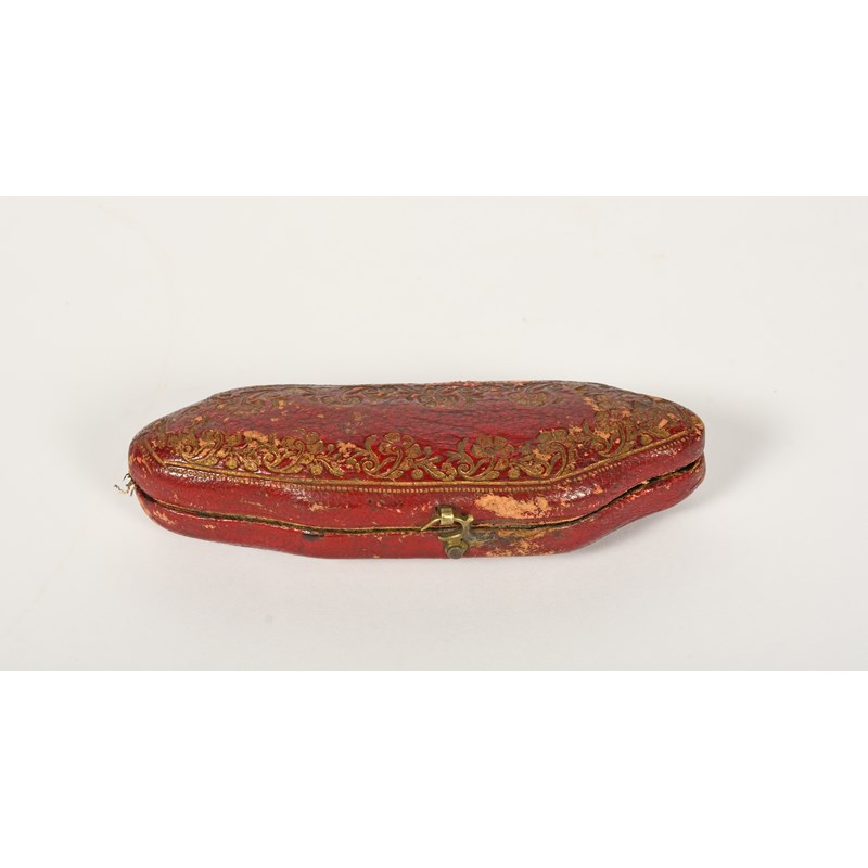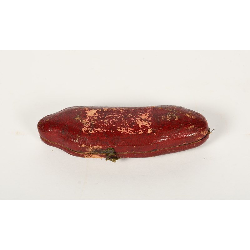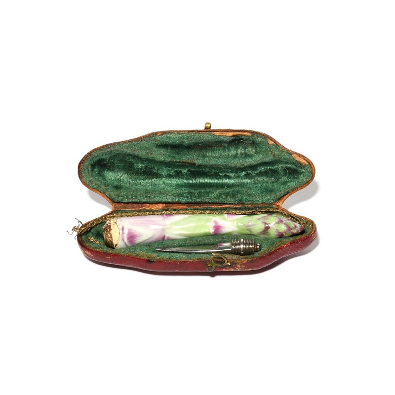 A rare Meissen porcelain quill knife, mid 18th century, modelled as a stem of asparagus, with gilt metal mounts, with a small removable blade, contained in a contemporary fitted red leather case with gilt tooling, 11.3cm (with blade extended).