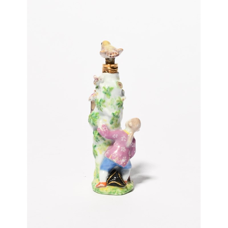 A Chelsea scent bottle, c.1760, modelled as a bird catcher, crouched at the foot of a stump and resting one hand on a bird cage, a further cage resting higher up the tree, with gilt metal mounts and a stopper formed as a bird, some restoration to the stopper and base, 8.8cm.