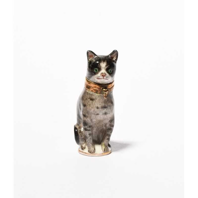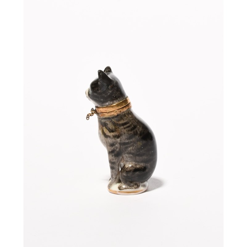 A Continental porcelain scent bottle, late 18th/19th century, modelled as a tabby cat seated on its