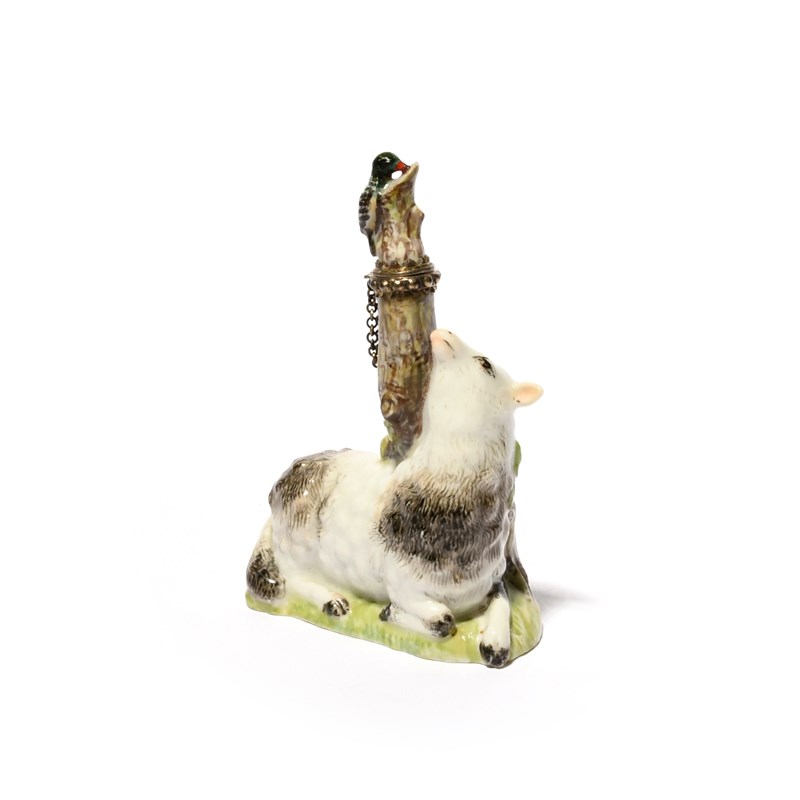 A German porcelain figural scent bottle, late 18th century, modelled as a recumbent sheep beneath a tree stump with a woodpecker atop, faint blue factory mark, with silver-coloured mounts, minor restorations, 9.3cm.