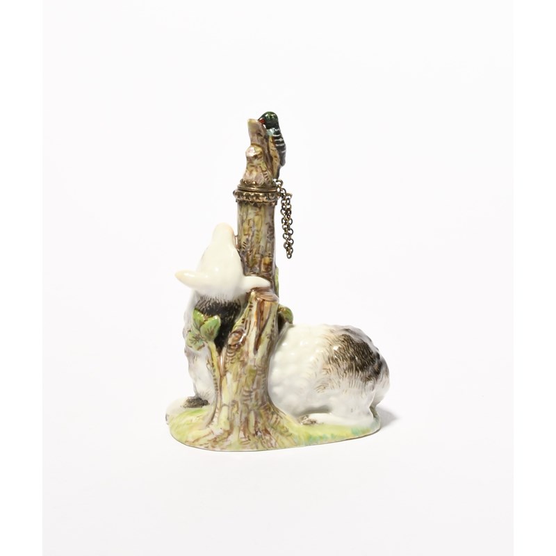 A German porcelain figural scent bottle, late 18th century, modelled as a recumbent sheep beneath a