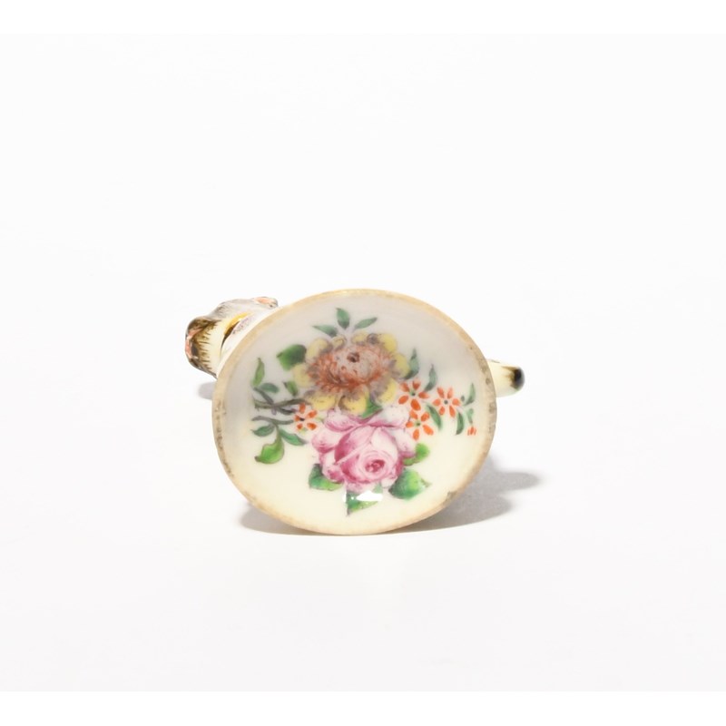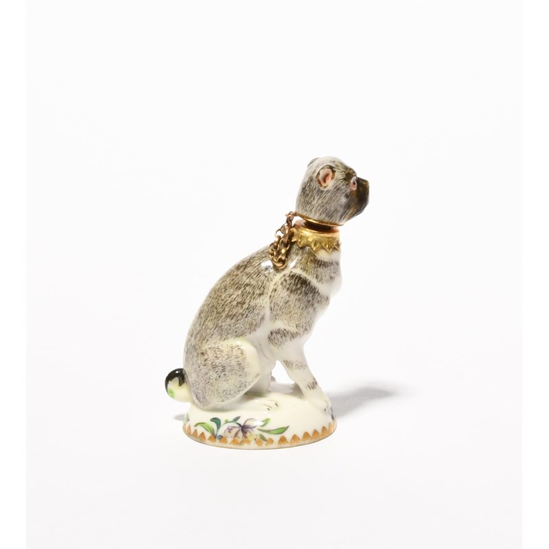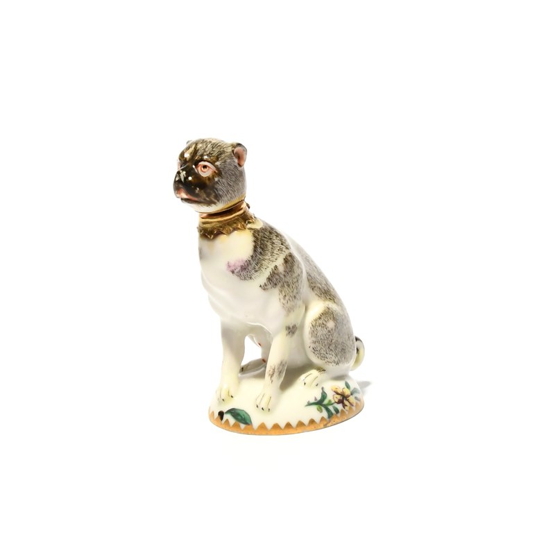 A Chelsea scent bottle modelled as a pug, c.1760, the dog seated on its haunches, with gilt metal mounts to its neck, on a mound base painted with flower sprays to both sides, 6cm.