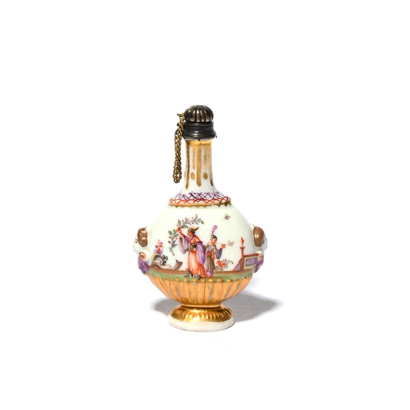 A Meissen scent bottle, c.1730, of flattened pilgrim flask form, finely painted probably outside the