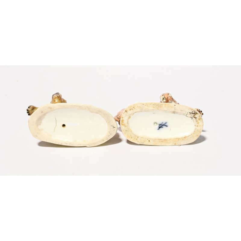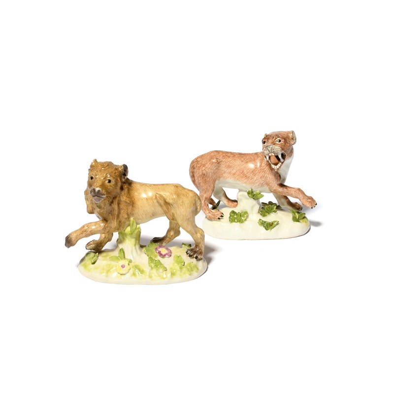A matched pair of Meissen figures of a lion and lioness, c.1760-70, each modelled with head turned and one forepaw outstretched, raised on low oval bases applied with flowers and leaves, the lioness baring her teeth, blue crossed swords marks, 7.8cm high max. (2)