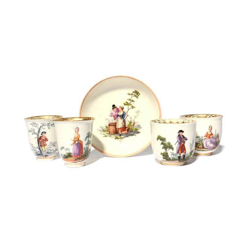 Three Vienna coffee cups with a beaker and a saucer, c.1770, the two larger cups painted by Andreas P Oettner, one with a gentleman leaning on his cane, the other with a lady seated in a garden, the other cups of slender form and painted with a standing lady, the chocolate beaker painted with a girl carrying an urn and a boy standing by a tree, blue shield marks, the saucer early, c.1749, and painted with an older peasant couple standing beside a barrel, rare crowned shield mark, 13.5cm max. (5)