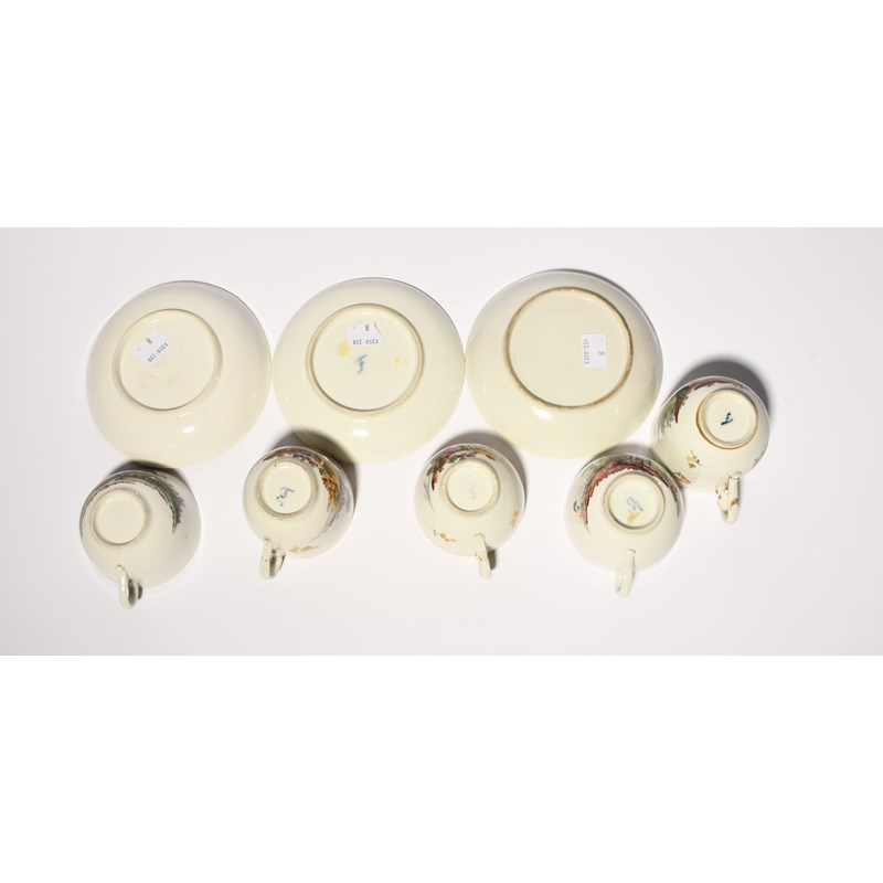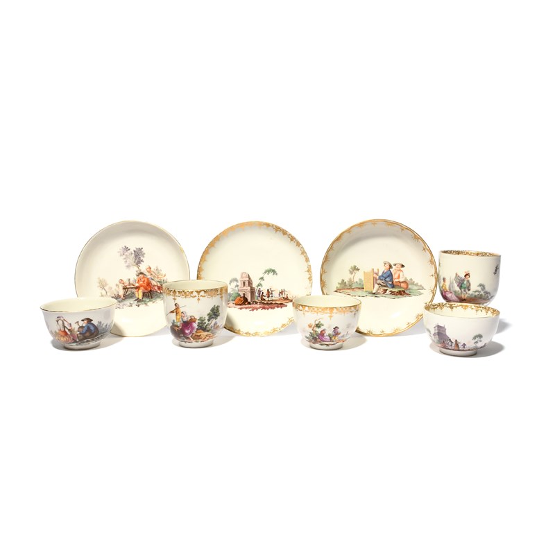 A group of German porcelain teawares, c.1760-70, including a Nymphenburg cup and saucer, painted with Dutch style peasant scenes of figures pouring wine and seated at a table, a Nymphenburg saucer painted by Joseph Kaltner with two men seated beside a fruit press, a Furstenberg teacup and saucer painted by Andreas Oettner with figures before buildings and ruins, a Furstenberg coffee cup painted with a couple in woodland, and a teacup and coffee cup from the same service painted with peasant figures including a child fishing from a bank, 13.5cm max. (8)