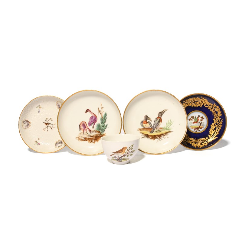 A rare pair of German porcelain ornithological saucers, c.1770-80, possibly Ansbach, naturalistically painted with pairs of birds, one with flamingoes and one with toucans, a moulded Ludwigsburg saucer painted with a central goldfinch within small landscape panels, an Ansbach cup, c.1765, painted with a robin on a branch, and a later Continental saucer painted in the Sèvres manner with a bird reserved on a deep blue ground with gilt foliate scrollwork, blue DT mark, 14.7cm max. (5)