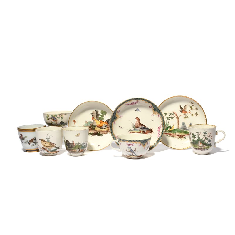 A group of German porcelain teawares, c.1770-90, all with bird decoration, including a Höchst coffee cup and saucer painted with farmyard birds including a turkey, probably by Joseph Angele or Johann Heinrich Usinger, another coffee cup painted with a willow warbler, a Berlin cup painted with a goldfinch after a design by Gottlieb Friedrich Riedel, a Furstenberg teacup and saucer painted with bird subjects, possibly by Johann Christof Kind, a Nymphenburg cup and saucer painted with game and song birds amidst trees, and a Nymphenburg teacup with a bird in a tree, hexagram mark to the latter, 13.4cm max. (9)