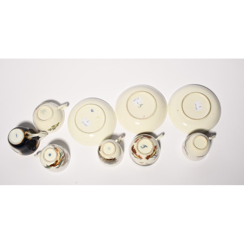 A group of German porcelain teawares, c.1770-90, all with bird decoration, including a Höchst coffee