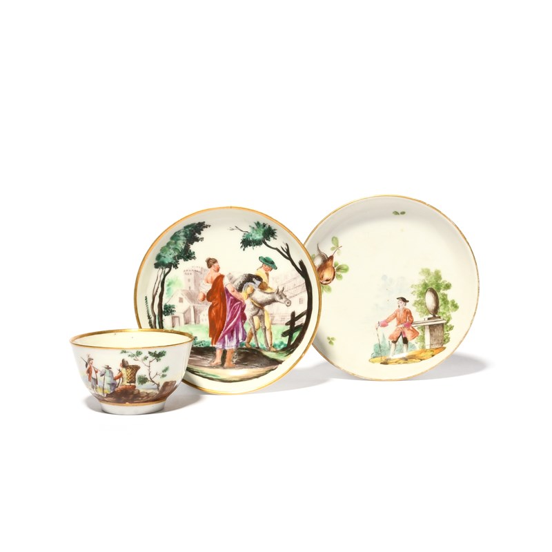 A rare Nove teabowl and two saucers, c.1765-70, the teabowl painted with travelling figures in a continuous landscape, the saucer with two peasant figures and a laden mule flanked by trees, red star marks, the other saucer Cozzi and painted with a gallant carrying a cane and standing beside garden statuary, 12cm max. (3)