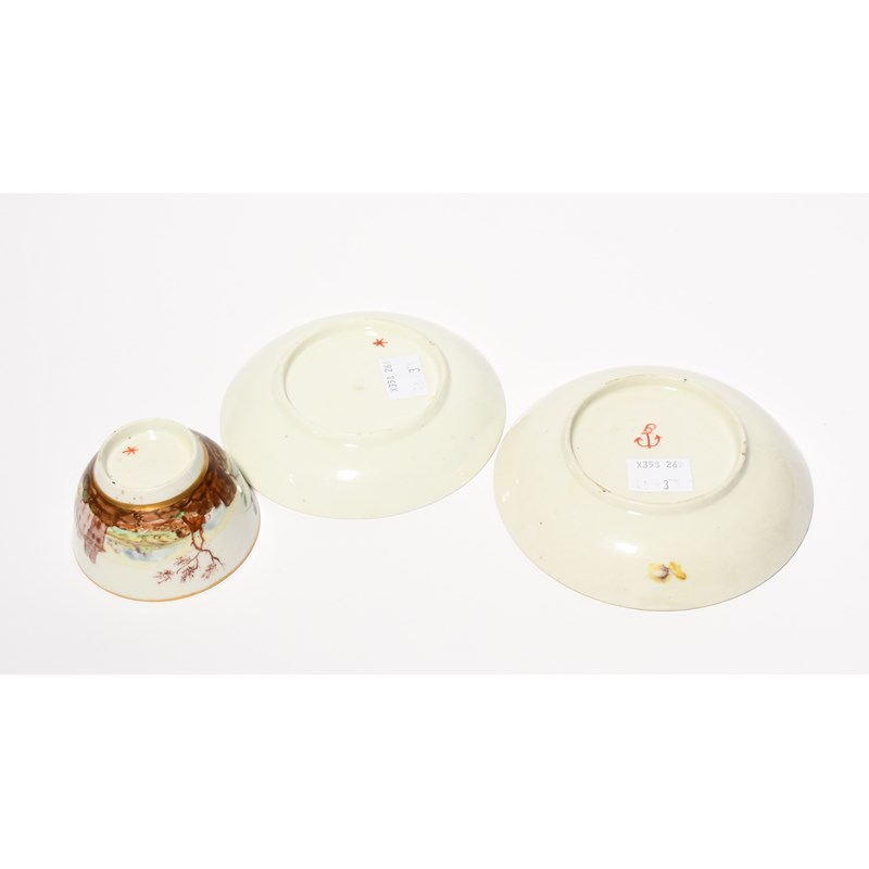 A rare Nove teabowl and two saucers, c.1765-70, the teabowl painted with travelling figures in a