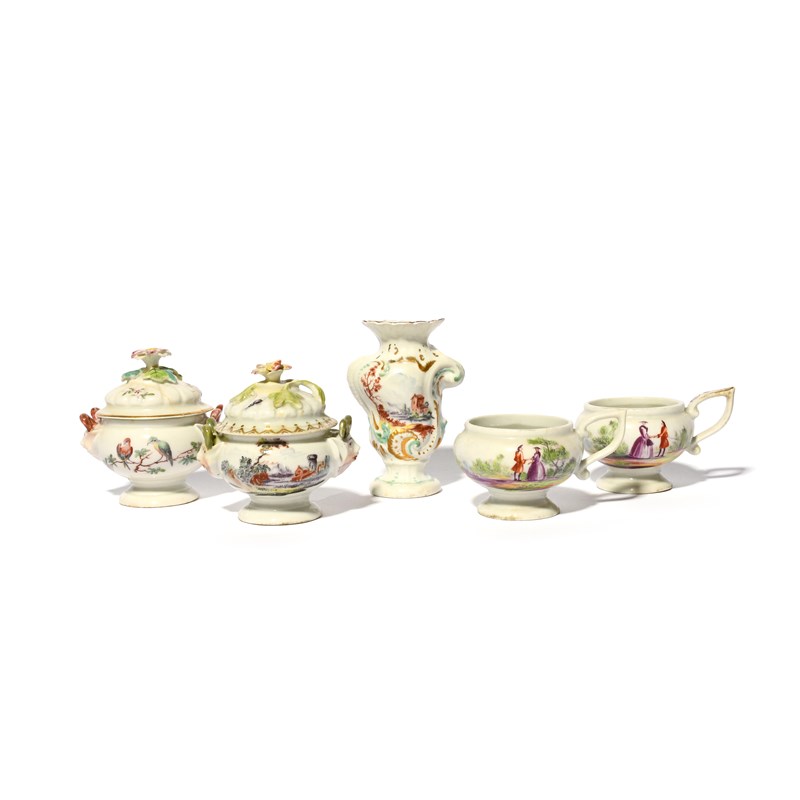 Two small Derby pots and covers, c.1760, applied with mythical mask handles and painted with birds, landscapes and flowers, a pair of footed pots with wishbone handles, painted with couples, and a miniature rococo scroll vase painted with a landscape and a large butterfly, some damages and repairs, 8.8cm max. (7)