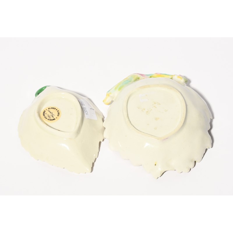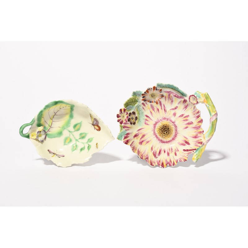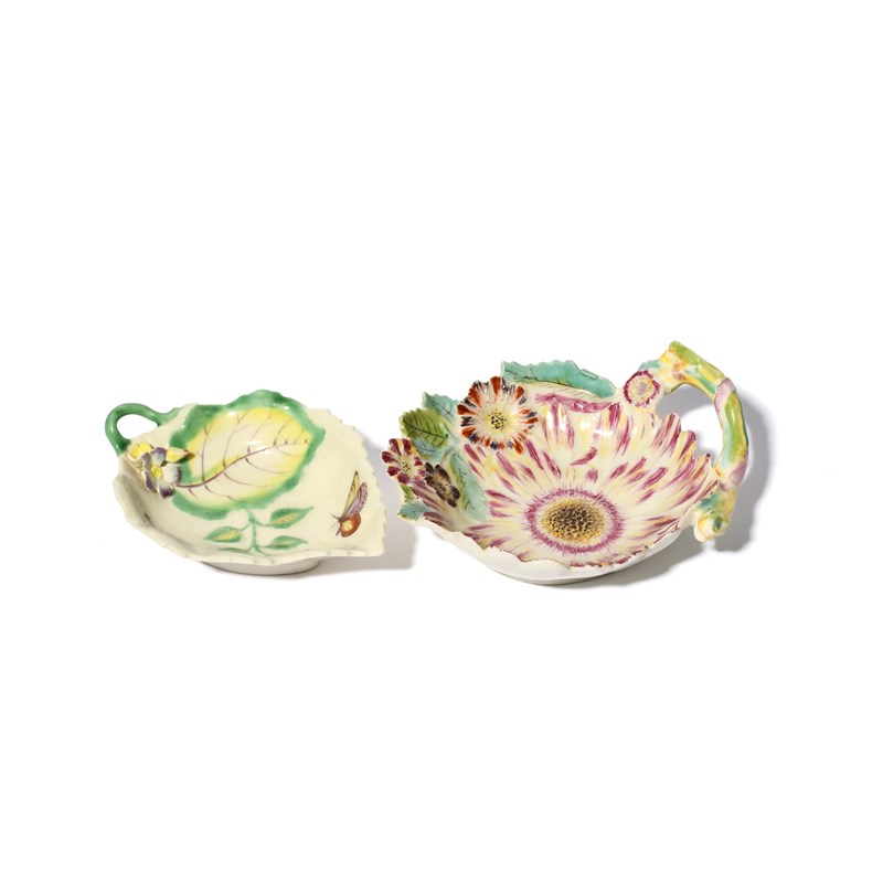 A small and rare Derby sunflower dish, c.1755, modelled as a large flower edged on one side with further flowers and leaves, and a small Longton Hall leaf dish, moulded with further leaves and painted with a moth and other flying insects, the handle of the first dish broken and restuck, 12.5cm max. (2)