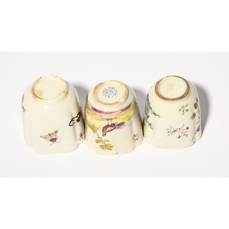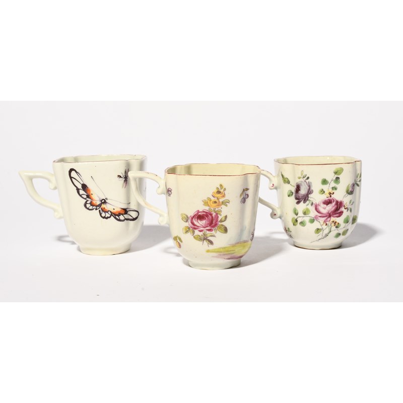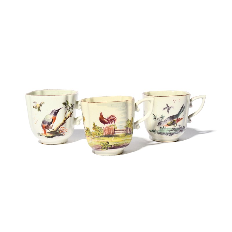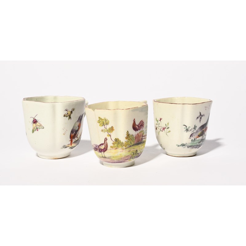 Three Derby coffee cups, c.1756, of square section with canted corners, one painted with a cockerel and hen, the others with birds perched on the ground or low branches beside others in flight, two reverses with flower sprays, one with a large butterfly, brown line rims, with wishbone handles, one cracked, 6cm high. (3)
