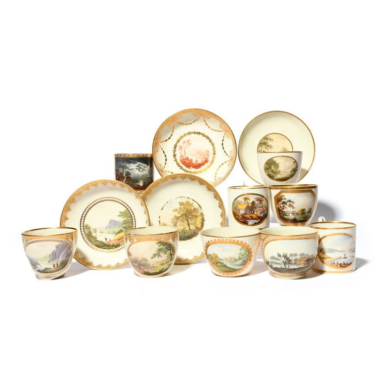 A group of Derby teawares, c.1790-1800, including three cups and saucers painted with small figures in landscape panels, a cup with similar decoration by George Robertson, another by Zachariah Boreman, a saucer with a monochrome landscape by Zachariah Boreman, a pair of coffee cans with waterside scenes including a water mill, and a larger can painted with a moonlit scene after Claude-Joseph Vernet, 14cm max. (13)