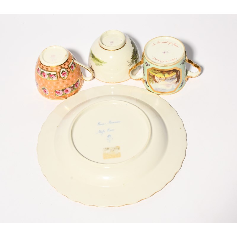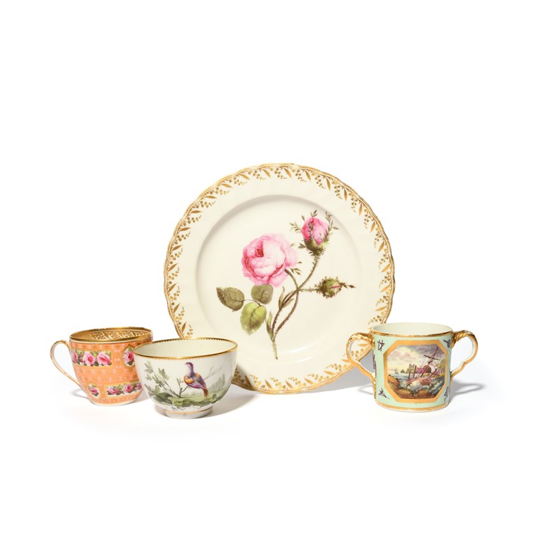 A Derby plate attributed to William Billingsley, c.1790, finely painted with a botanical specimen of a pink rose, titled 'Moss Rose' and 'Rosa Muscosa', large Derby teabowl painted with a colourful bird perched on a leafy branch, a Derby cup in pattern 269 with pink rose panels on a salmon ground with gilt stars, and a two-handled mug painted with a ship in a swell, the reverse with a farmstead scene, reserved on a pale green ground, 2.7cm max. (4)