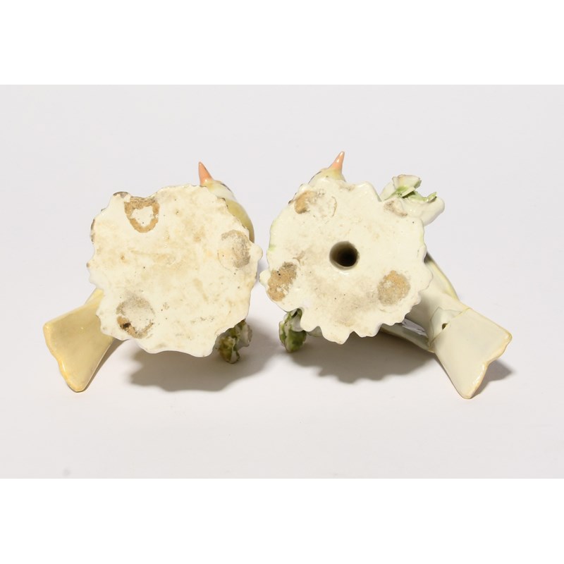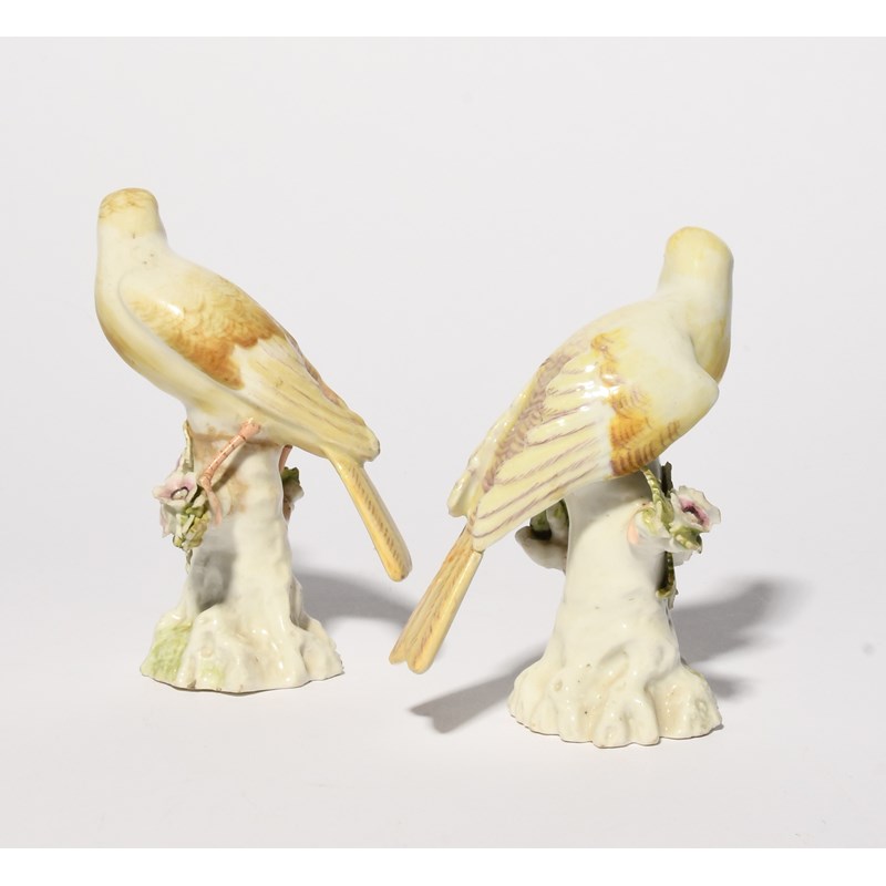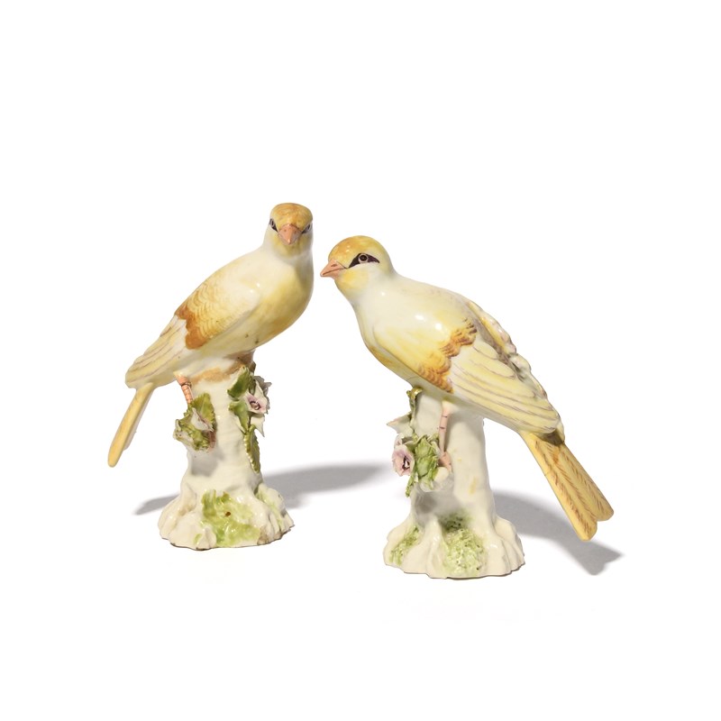 A pair of Derby models of finches or canaries, c.1765, each bird modelled perched on a tall stump applied with flowers and leaves, their heads slightly turned and yellow plumage delicately detailed in puce, repairs to both tails, 13cm. (2)