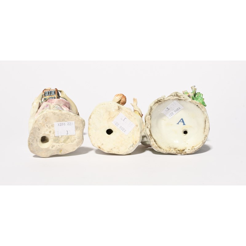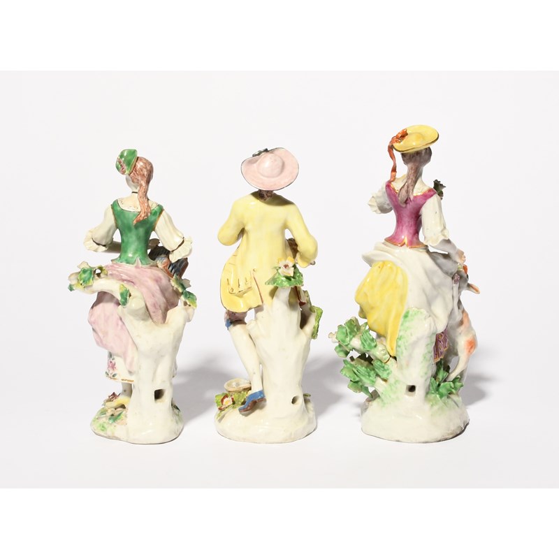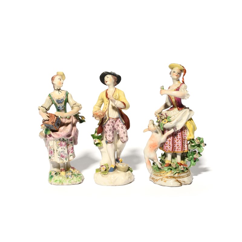 Three Bow figures, c.1765, including a matched pair of figures of a gallant and his companion, possibly emblematic of Matrimony and Liberty, she holding a bird cage and he a nest, and a figure of a shepherdess, some damages and repairs, 19.5cm max. (3)