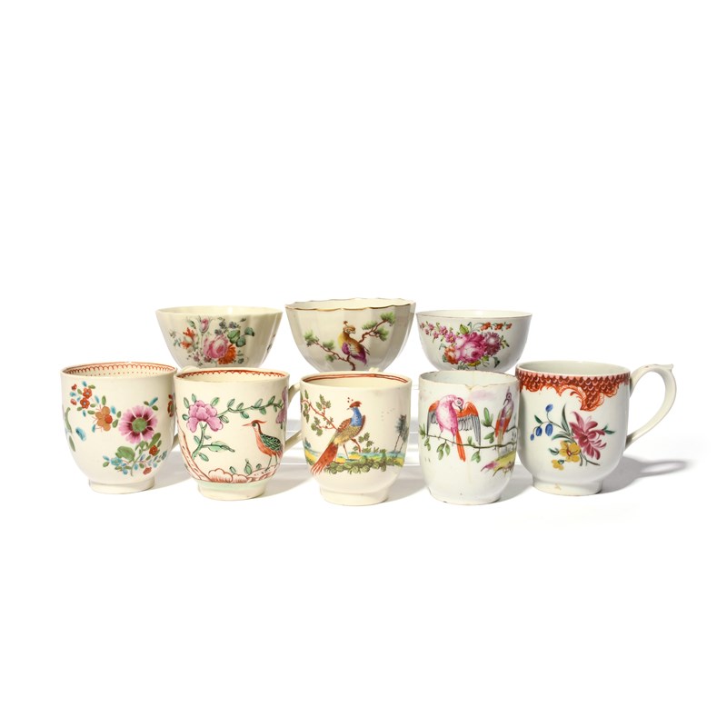A group of English porcelain tea and coffee wares, c.1755-80, including a Longton Hall teabowl painted with flowers, a Longton Hall coffee cup painted with colourful birds, two Liverpool coffee cups painted with exotic birds, a Worcester-style fluted teabowl painted with a bird on a branch, a Pennington's Liverpool coffee cup with Oriental flowers, a fluted teabowl painted with flowers and a large coffee cup with flowers and pink scale panels, some faults, 6.8cm max. (8)