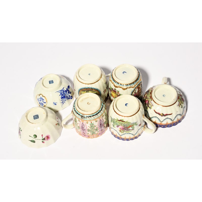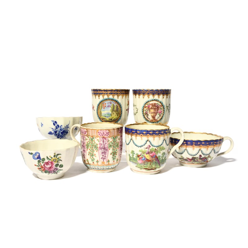 A group of Worcester fluted teawares, c.1770-80, two coffee cups painted with the Dalhousie manner with beaded panels flanked by flower and fruit sprays, one cup with a panelled 'Hop Trellis' Holly Berry pattern, a coffee cup and teacup with fancy birds beneath a turquoise husk garland band, the other two teabowls of Warmstry fluted form and painted with polychrome and dry blue flowers, 6.5cm max. (7)
