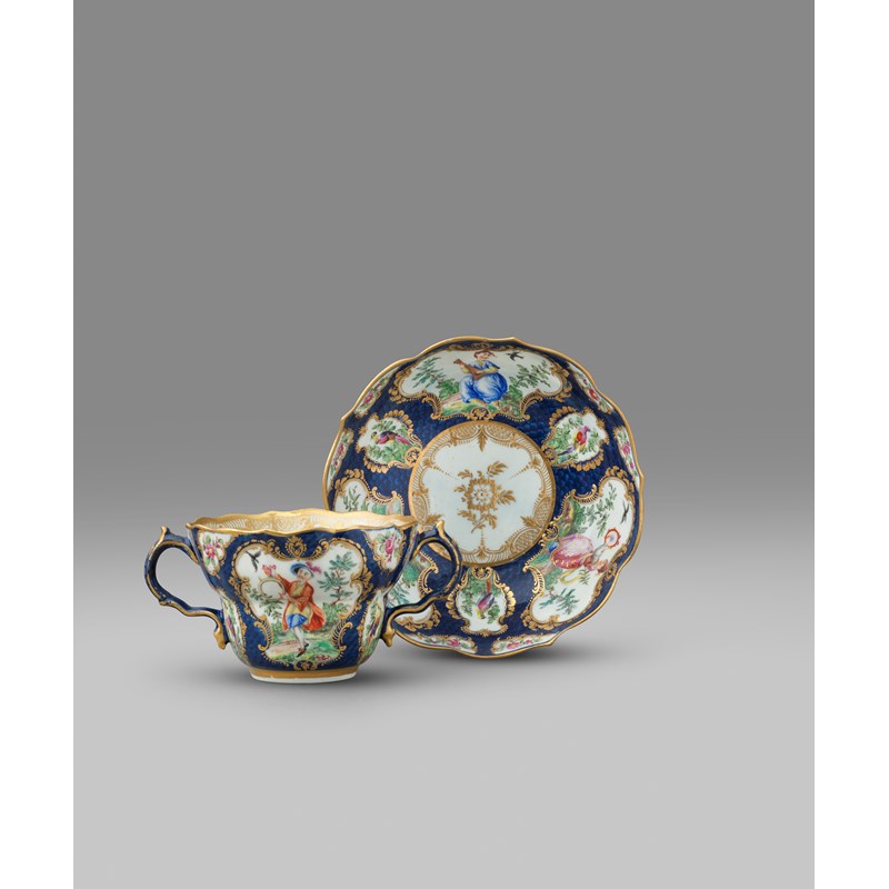 A rare Worcester chocolate cup and stand, c.1768-70, the ogee form decorated in the Chinoiserie Musicians pattern with panels of Oriental Watteau-esque figures with various instruments, with smaller panels of birds and flowers, reserved within gilt scroll borders on a blue scale ground, blue square seal marks, some good restoration to the cup, 14.5cm. (2)