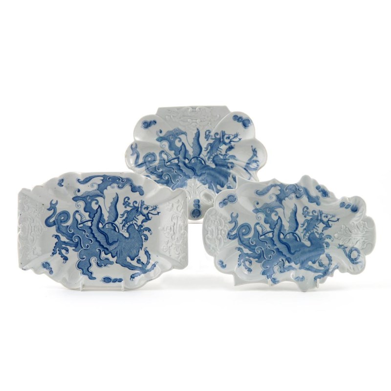 Three Mason's Ironstone shaped dishes 19th century, the three differing elaborate forms printed with large winged dragons, printed and impressed marks, 28.5cm max. (3)