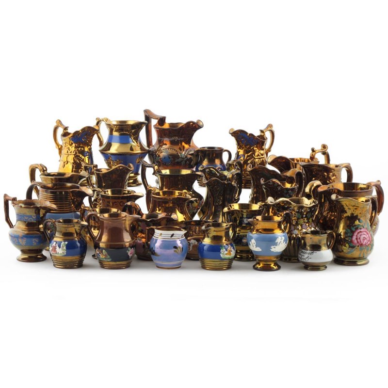 A collection of thirty one copper lustre jugs most 19th century, variously moulded and enamelled with flowers, foliage, figures and mottoes, 18.5cm max. (31)