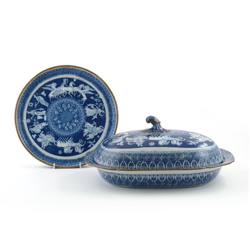 A large pearlware blue and white tureen and cover 19th century, printed with Classical figures and winged chariots, and a matching circular stand, 43cm max. (3)