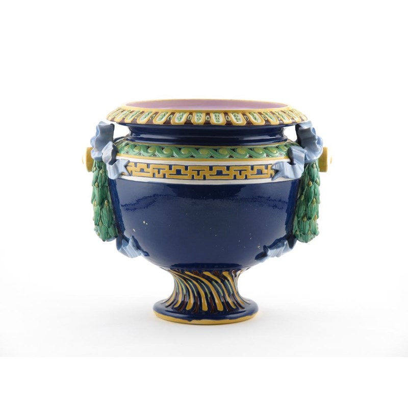 A large Minton Majolica jardinière 2nd half 19th century, the rich cobalt blue body applied with handles of leafy wreaths tied with blue ribbon, impressed marks and indistinct date code, the interior glazed a pinkish mauve, 42cm dia.