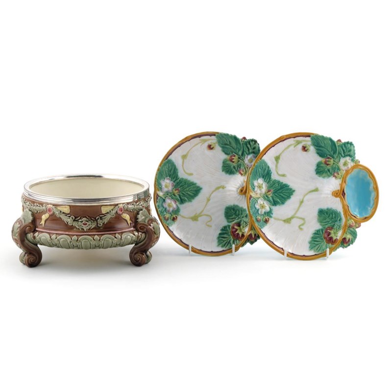 A pair of Minton Majolica strawberry dishes c.1869, moulded with fruit, flowers and leaves, impressed marks and date code, and a Wedgwood Majolica three-footed bowl with a silver metal rim, 25cm max. (3)