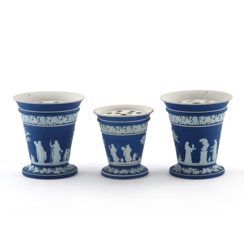 A Wedgwood Jasperware garniture of three vases and covers c.1900, the flared forms applied with Classical figures, putti and trees within bands of grapevine and flowers, the circular covers pierced with holes, impressed factory marks, 14.8cm max. (6)