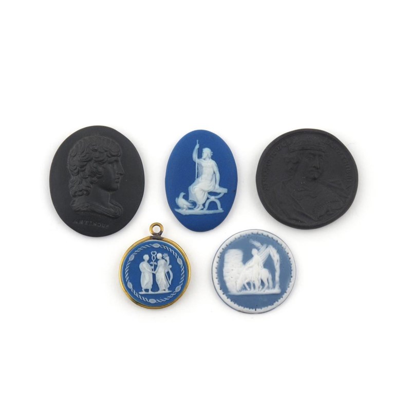 Three Jasperware and two black basalt medallions or cameos 19th century