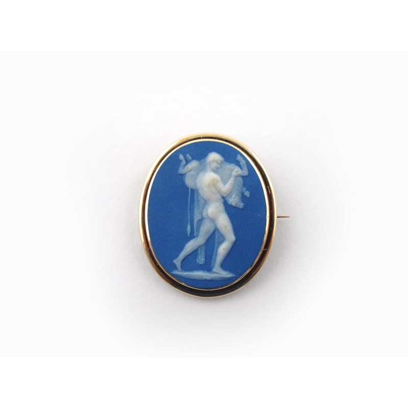 A Wedgwood Jasperware cameo brooch late 18th / early 19th century, probably after a design by John Flaxman, applied with Hercules carrying the slain Cretan Bull over his shoulder, with a gold metal mount, 2.2cm.