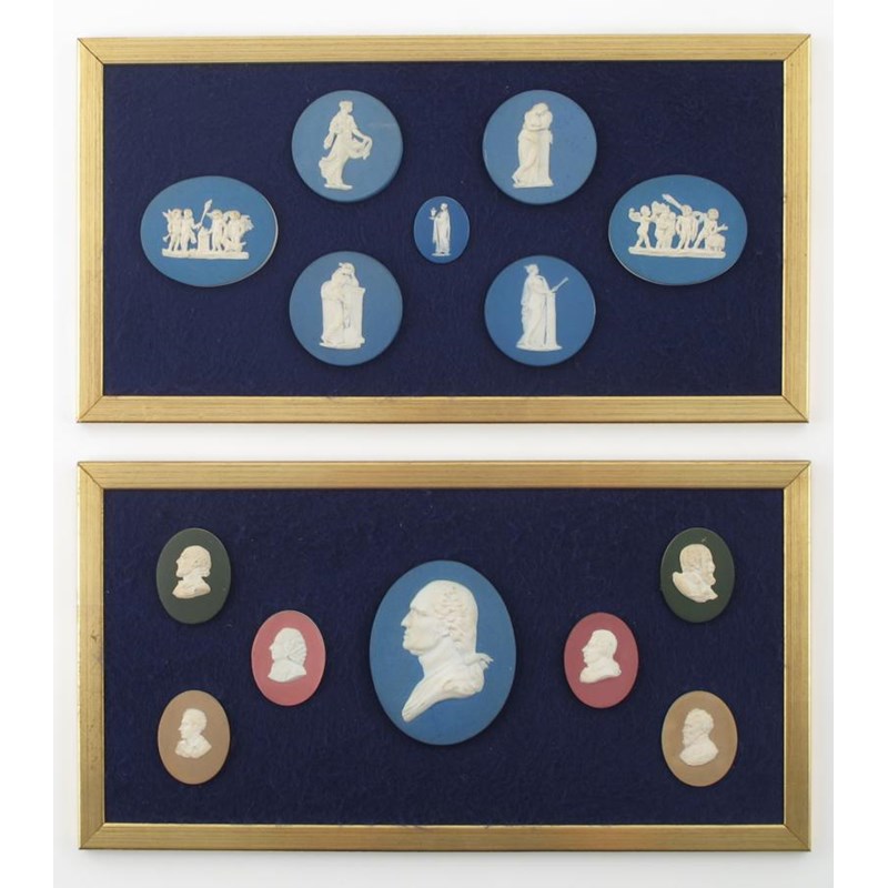 Fourteen Jasperware plaques mounted on two boards early 19th century