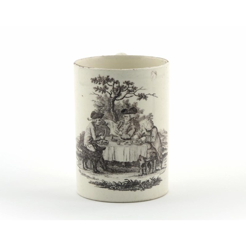 A creamware printed mug c.1775, probably Herculaneum, decorated with three men eating at a table beneath a tree, one reading a newspaper, while two dogs look up expectantly, 14.8cm high.