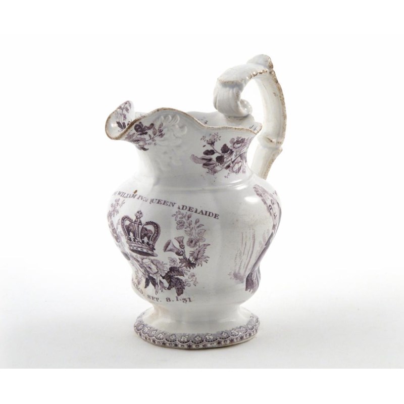A commemorative Coronation jug c.1831, printed in purple with King William IV and Queen Adelaide, inscribed with their names and 'Crowned Sep. 8. 1831', 17.5cm high.