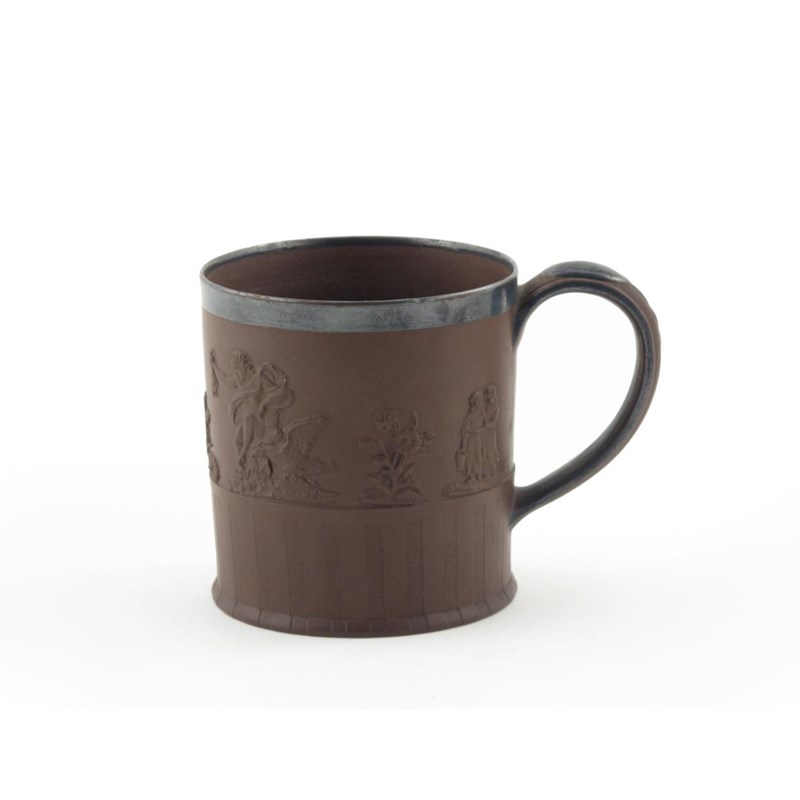 A Samuel Hollins red stoneware mug c.1800, sprigged with children, putti, Classical figures and flowers, impressed 'S. Hollins', 8.5cm.