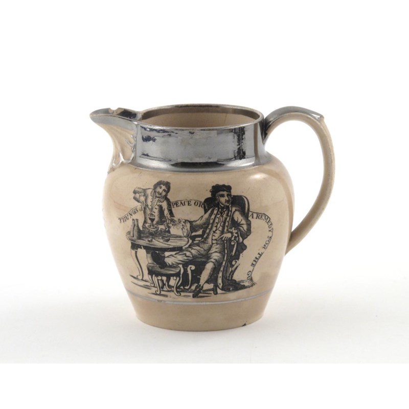 A small pearlware commemorative lustre jug c.1815, celebrating Wellington's victory at Waterloo, one side printed in black with a gout sufferer being poured a glass of wine, inscribed 'Tidings of Peace or a Remedy for the Gout', the reverse with a poem of victory and celebration, beneath a silver lustre rim, a crack to the base, 11.3cm.