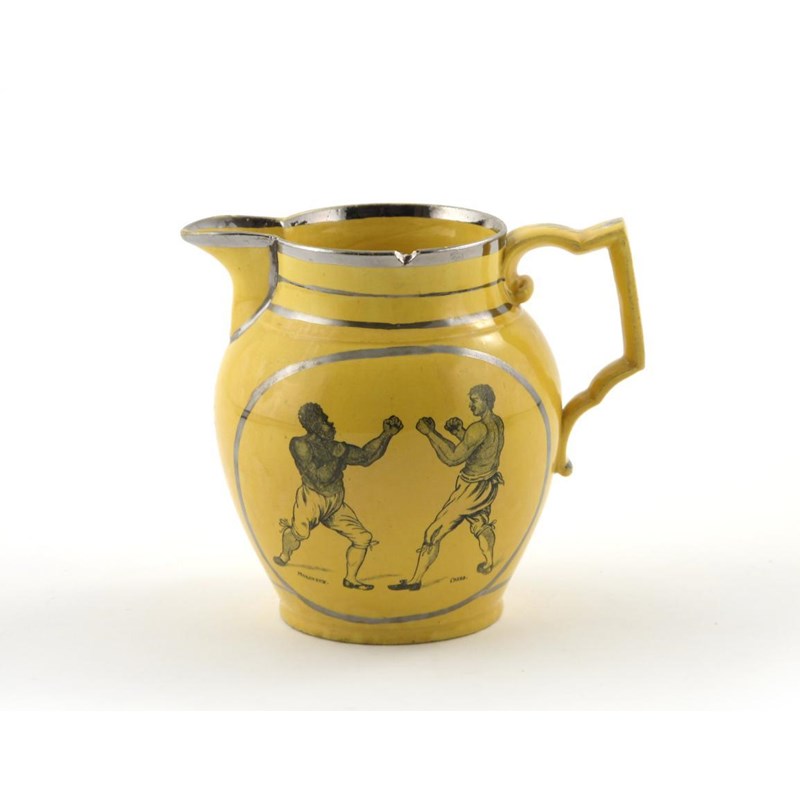 A rare yellow pearlware lustre jug of pugilist interest c.1811, commemorating the great fight between Tom Molineux and Tom Cribb at Thistleton Gapp in Rutland in September 1811, printed with the two boxers in fighting stance, the other side with a verse celebrating the strength of boxing in Britain, on a yellow ground within silver lustre borders, 14.5cm high.