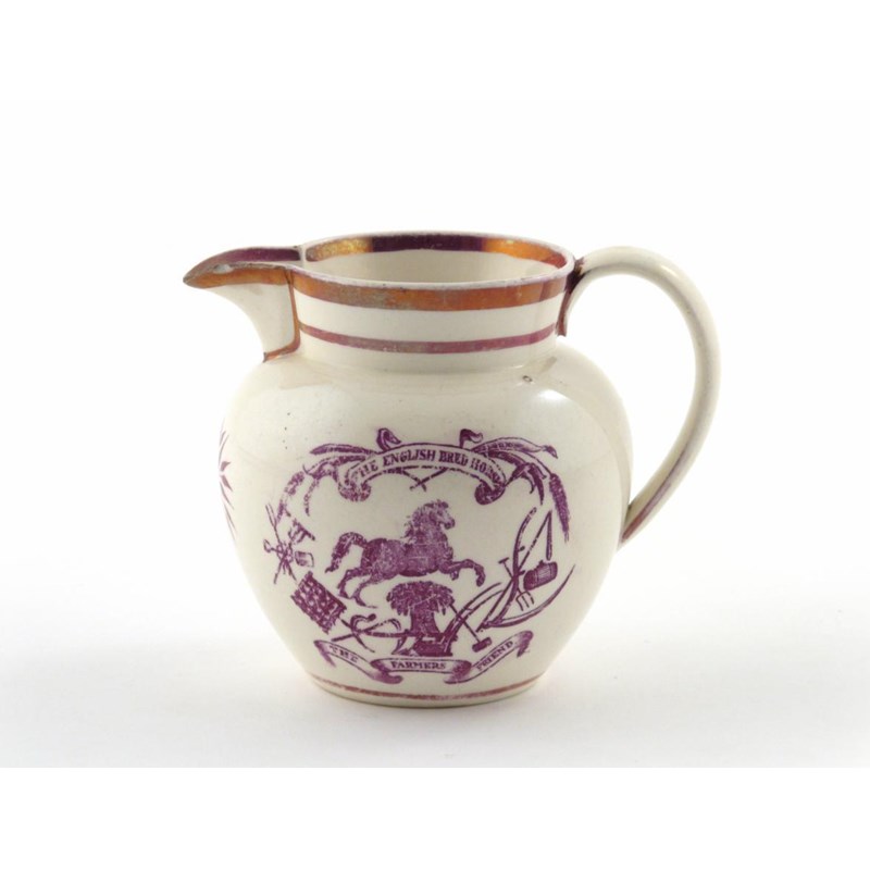 Equestrian interest: a creamware lustre jug 1st half 19th century, printed in purple with a galloping horse and other farming implements between banners proclaiming 'The English Bred Horse' and 'The Farmer's Friend', the reverse with a four line stanza, beneath purple lustre bands, tiny rim chips, 11.5cm high.