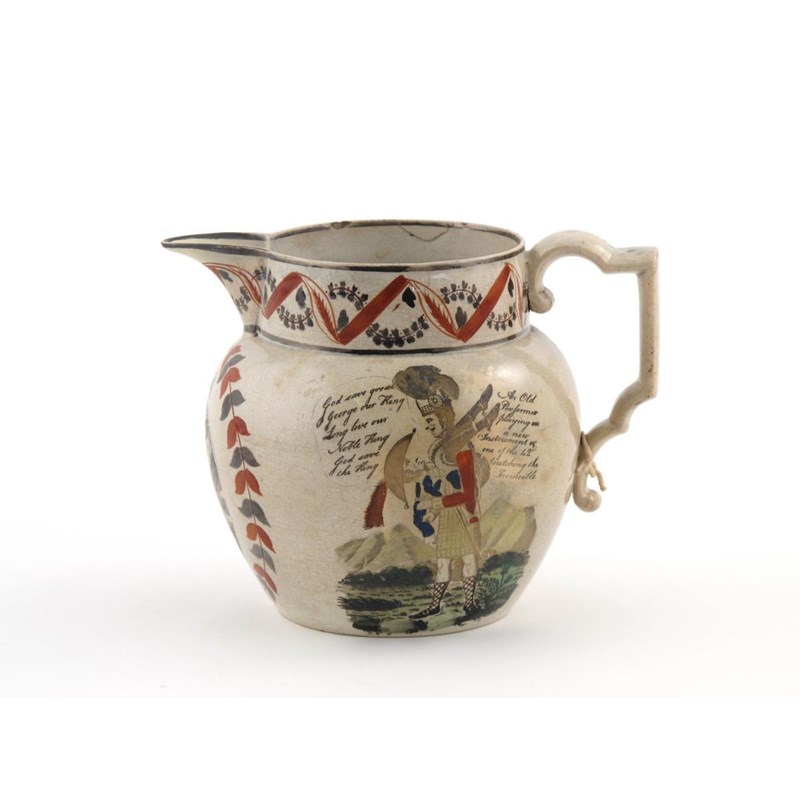 A rare pearlware commemorative jug of Napoleonic interest c.1803, printed and painted with a Highland soldier holding Napoleon like a set of bagpipes, titled 'An Old Performer playing a new Instrument or one of the 42nd touching the Invincible', the reverse with two soldiers titled 'One of the 71st taking a French Officer prisoner in Portugal', beneath the spout a lady and two children in a cartouche surmounted by two doves, some wear, a little restoration to the spout, 20.5cm.