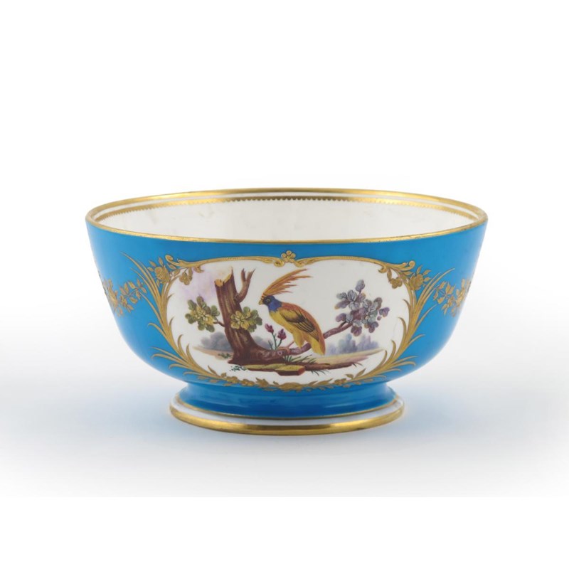 A large Minton porcelain bowl c.1900, painted with two panels of large parakeets within raised gilt foliate borders and flower garlands on a bright turquoise ground, printed mark, 24.7cm dia.