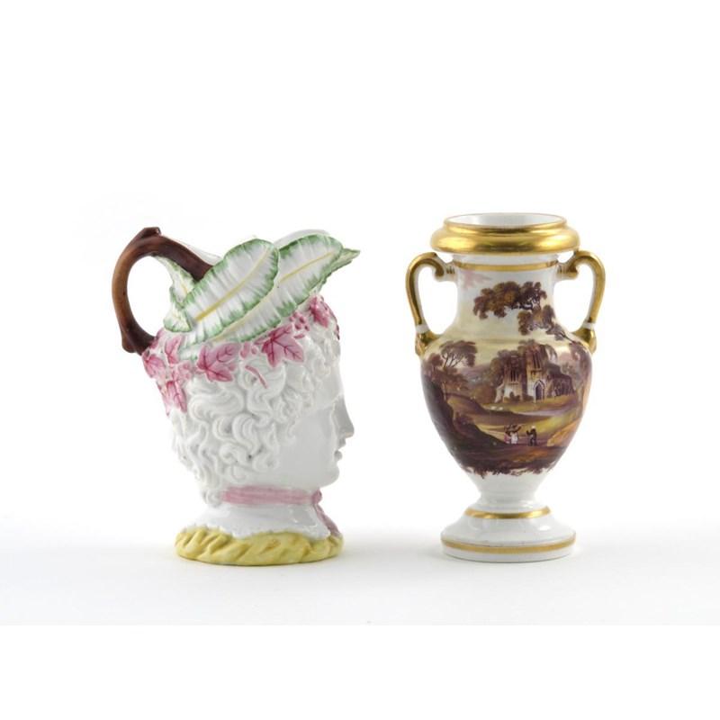 A Ridgway porcelain two-handled vase mid 18th century, painted in pattern 3/635 with figures before a ruined abbey, the reverse with a bridge before a stately home, and a porcelain mask jug, with detail highlights in green, pink and yellow enamels, 15cm. (2)