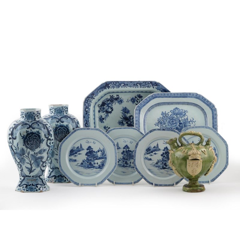 Six Chinese porcelain blue and white dishes 18th century, painted with vases of flowers and figures in landscape scenes, a pair of Delft vases painted with flowers within moulded panels, LPK marks, and a pottery armorial Sarum kettle applied with a shield and fleur de lys motifs, some damages, 38cm max. (9)