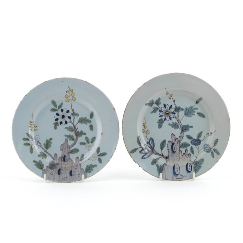 A pair of Bristol polychrome delftware plates 18th century, painted with flowers issuing from a gnarled tree stump, painted J marks to the reverse, one restored, 12.5cm. (2)