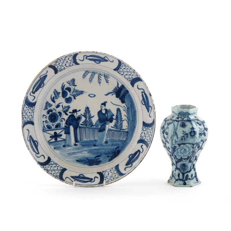 A large delftware blue and white charger 18th century, painted with a Chinese lady being approached by a European figure in a wide brimmed hat, and a Dutch Delft vase with raised and painted floral decoration, LPK mark, a little restoration to the charger's rim, 35.5cm. (2)