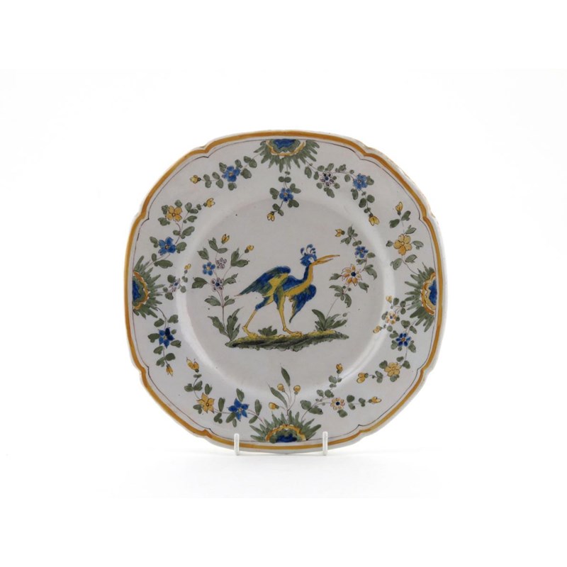 A Moustiers faïence dish 18th century, painted probably by Foque with a grotesque wading bird amongst trailing flowers, painted F mark to the reverse, 22cm.