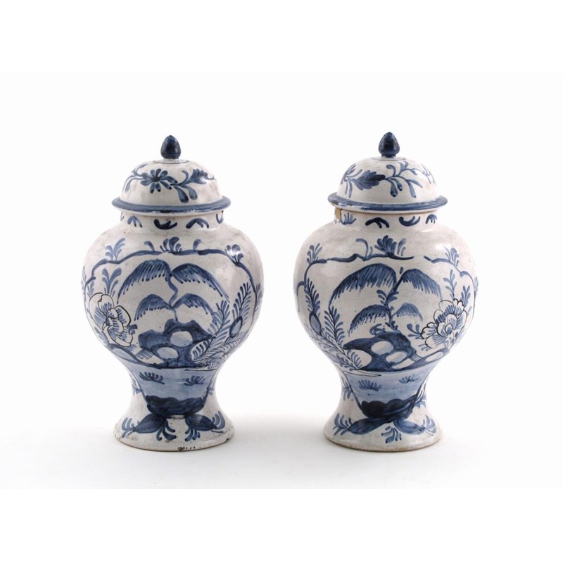 A pair of Delft small baluster vases and covers 18th century, painted in blue and black with Oriental flowers issuing from rockwork, 21cm. (4)